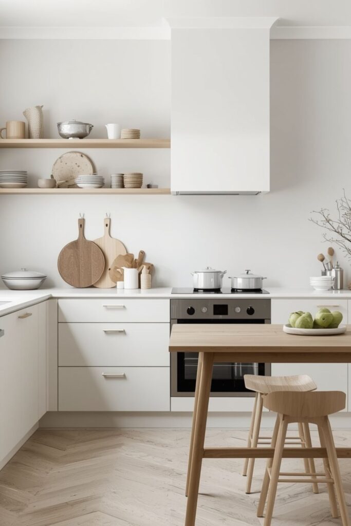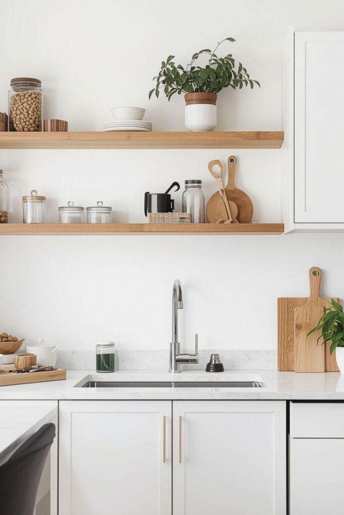Open shelving is a defining detail in Simple Nordic kitchen design in the UK. Floating wooden shelves help kitchens feel lighter than heavy upper cabinets, especially in small layouts. Shelves allow you to display only a few everyday items such as ceramic jars, glass storage containers, or small plants.