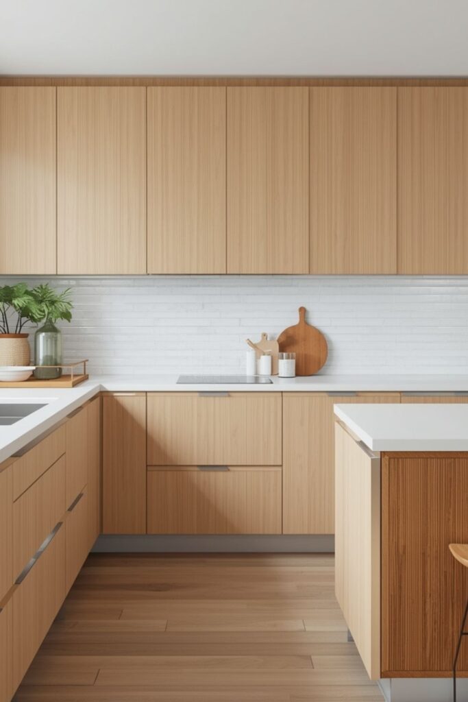 Wood cabinets pair beautifully with natural stone countertops, brushed metal fixtures, and soft ceramic backsplash tiles. Even a single wooden shelf or island panel can bring warmth into a minimalist space.