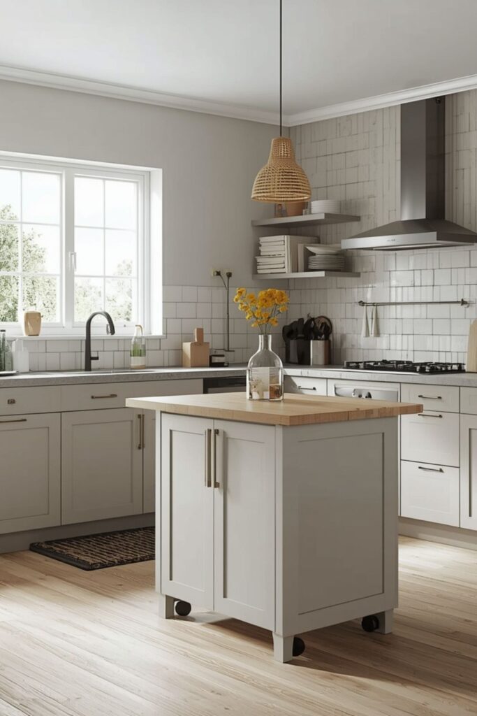 Many Cozy Nordic Kitchen Design Ideas include a modest central island for extra workspace and storage. Nordic kitchen islands are typically simple and natural, made from wood or matte finishes rather than high-gloss materials. They are built to be usable every day rather than decorative centerpieces.