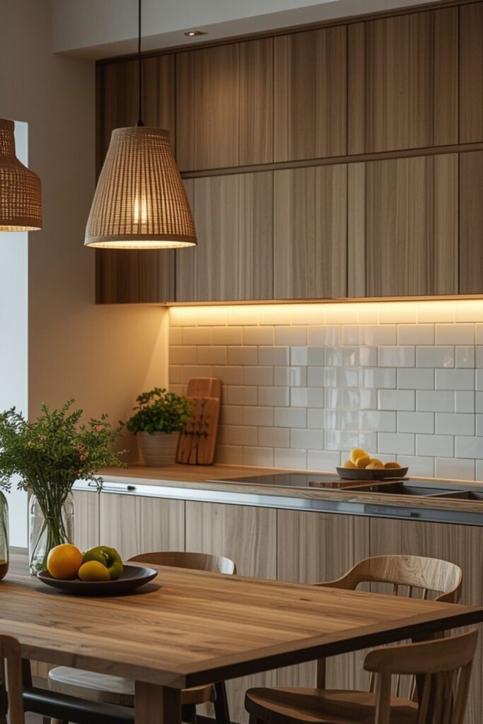 Layered lighting keeps the kitchen functional without harshness. This is one of the most effective Cozy Nordic kitchen design ideas because lighting changes how materials look throughout the day, making wood and ceramic textures feel even warmer.