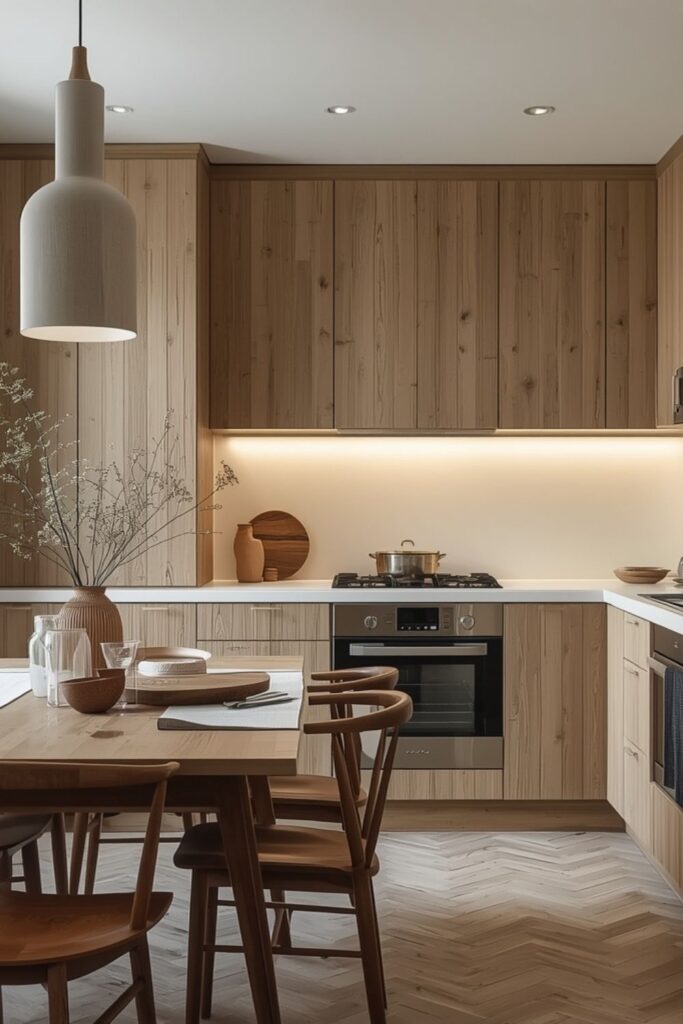 Cozy nordic kitchen cabinet ideas often start with light oak, ash, birch, or pine cabinetry. Wood brings warmth without overwhelming the space and adds a tactile presence that makes the kitchen feel grounded. Scandinavian kitchen cabinet design focuses on smooth grain patterns and handleless fronts for a clean, modern style.