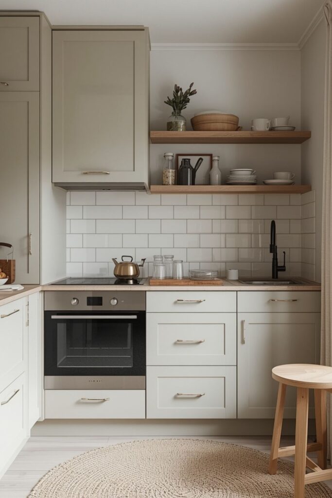 Small Nordic kitchens benefit from soft textiles and wood accents, like a natural woven rug or linen curtain, to bring warmth into tight spaces without adding clutter.