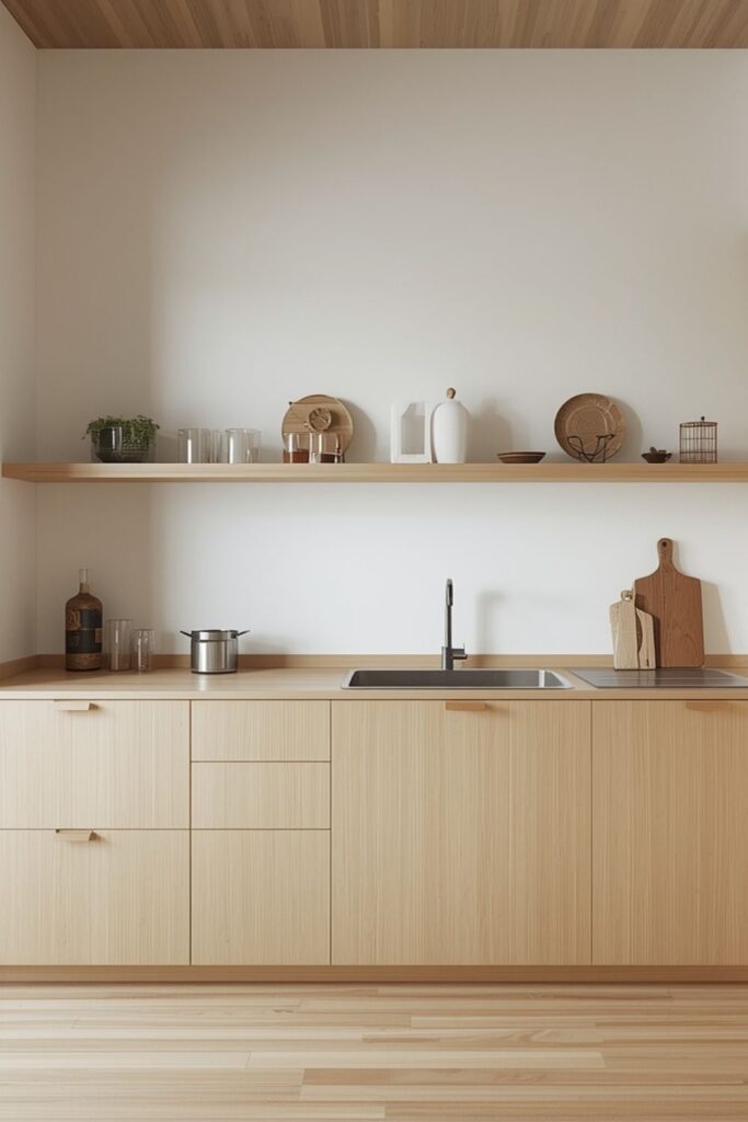 Floating shelves are common in minimal Japanese kitchen layout solutions because they reduce bulk and add gentle structure. Open shelves allow the eye to travel naturally across the wall while still providing storage. They are especially helpful in small kitchens where heavy upper cabinets would feel overwhelming.