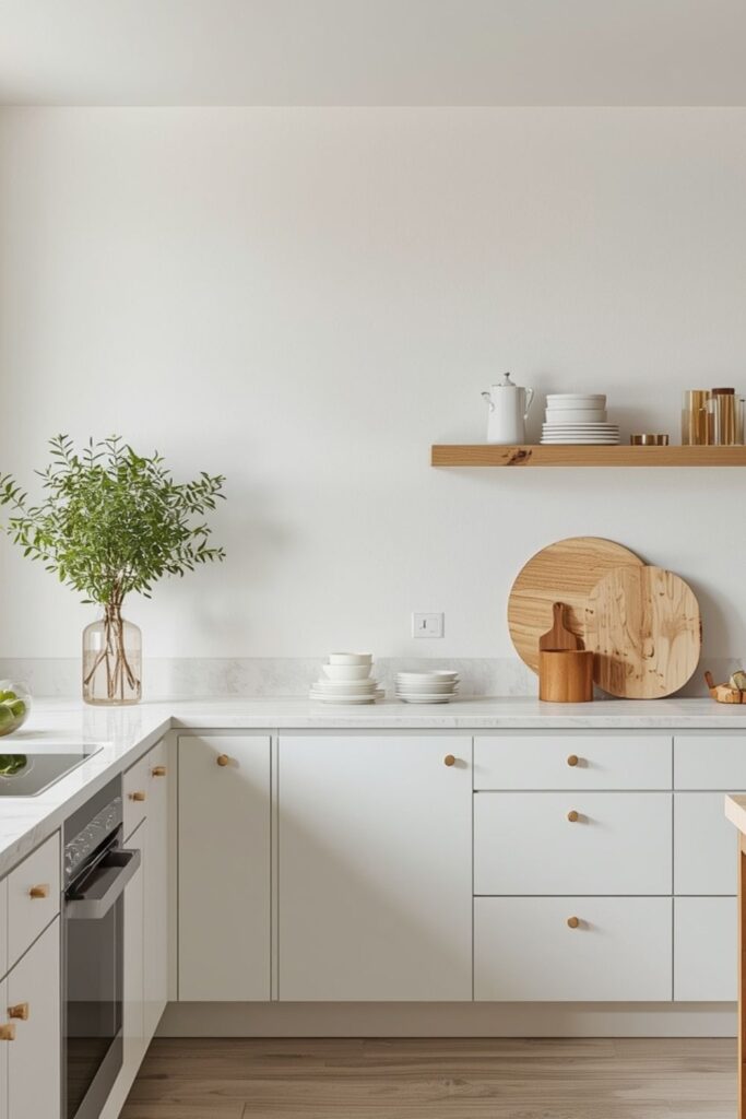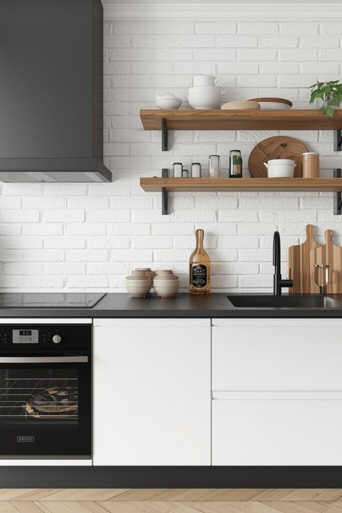 This approach works especially well in homes called Scandinavian design. The wood texture softens metal appliances and straight cabinet lines. Even a small wood area, such as behind open shelves or along one wall, adds calm depth and character.