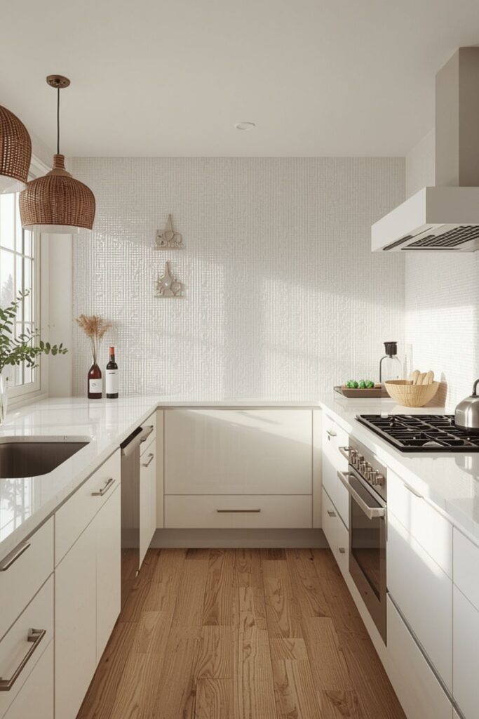 Many modern white kitchen ideas use reflective textures to make tight areas feel brighter. This effect helps small kitchens appear more spacious and inviting, especially during evening hours when warm lighting enhances the tile surface.