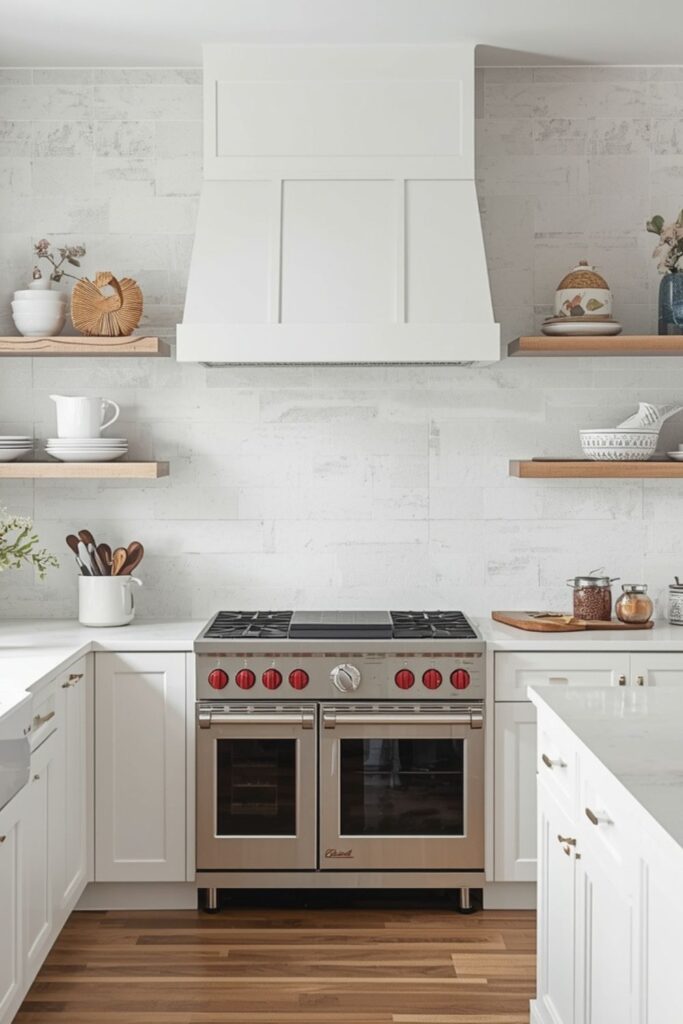 Plaster walls have a soft, handmade look that instantly warms up a white kitchen. A plaster surface introduces subtle curves and uneven strokes that catch natural light throughout the day. This type of simplicity brings character into the kitchen without relying on bold patterns or color contrast. Plaster works well behind open shelves or near windows where texture remains visible.