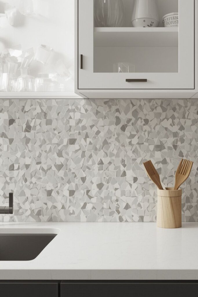 Mosaic tiles work well in narrow kitchens or as a backsplash strip near countertops. The key is to keep the palette light and unified, allowing texture to speak naturally through shape and surface rather than colour.